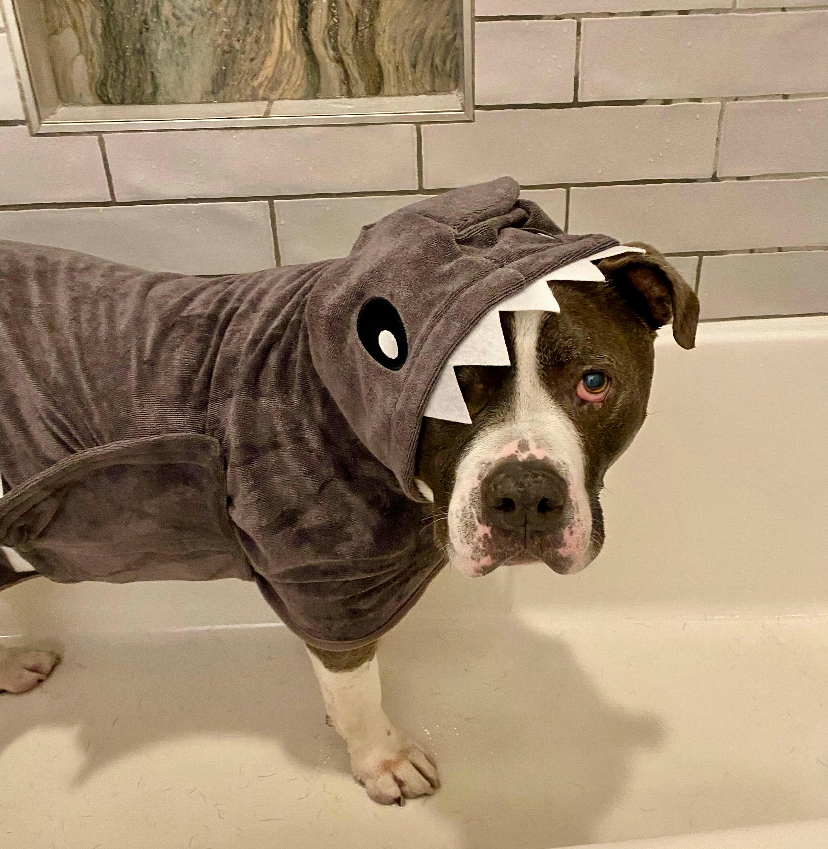 Love the Shark Robe I purchased for my boy Bull. Makes post bath time so much better. Now, instead of him rolling around all over the floor, carpets, furniture and beds trying to dry off, this robe is a perfect barrier to help him dry faster, keep him warm and keep my house clean from his post bath zoomies! Plus it supplies endless amounts of CUTE!