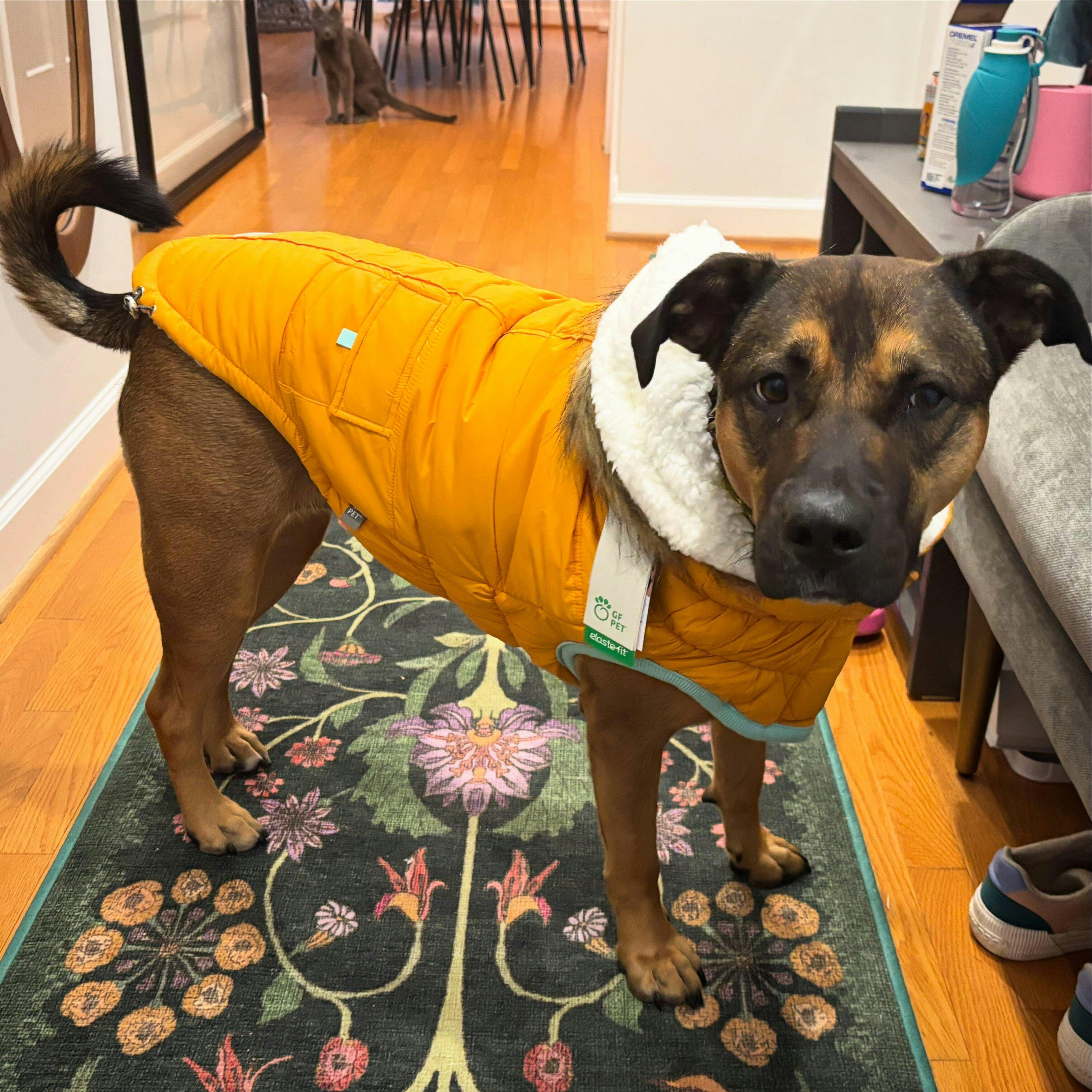 The Elastofit® ribcage and neck panels allows for comfort and freedom of movement for even the most muscular dogs. All GF Pet coats have drawstrings at the bottom edge, so you can cinch up any extra length! Plush faux sherpa lining. Strong velcro closures at the neck and ribcage make this jacket stay put. No more popping off when your dog starts running. Easy on/off, too, so great for seniors, tripods, dogs with injuries or any other mobility issues!