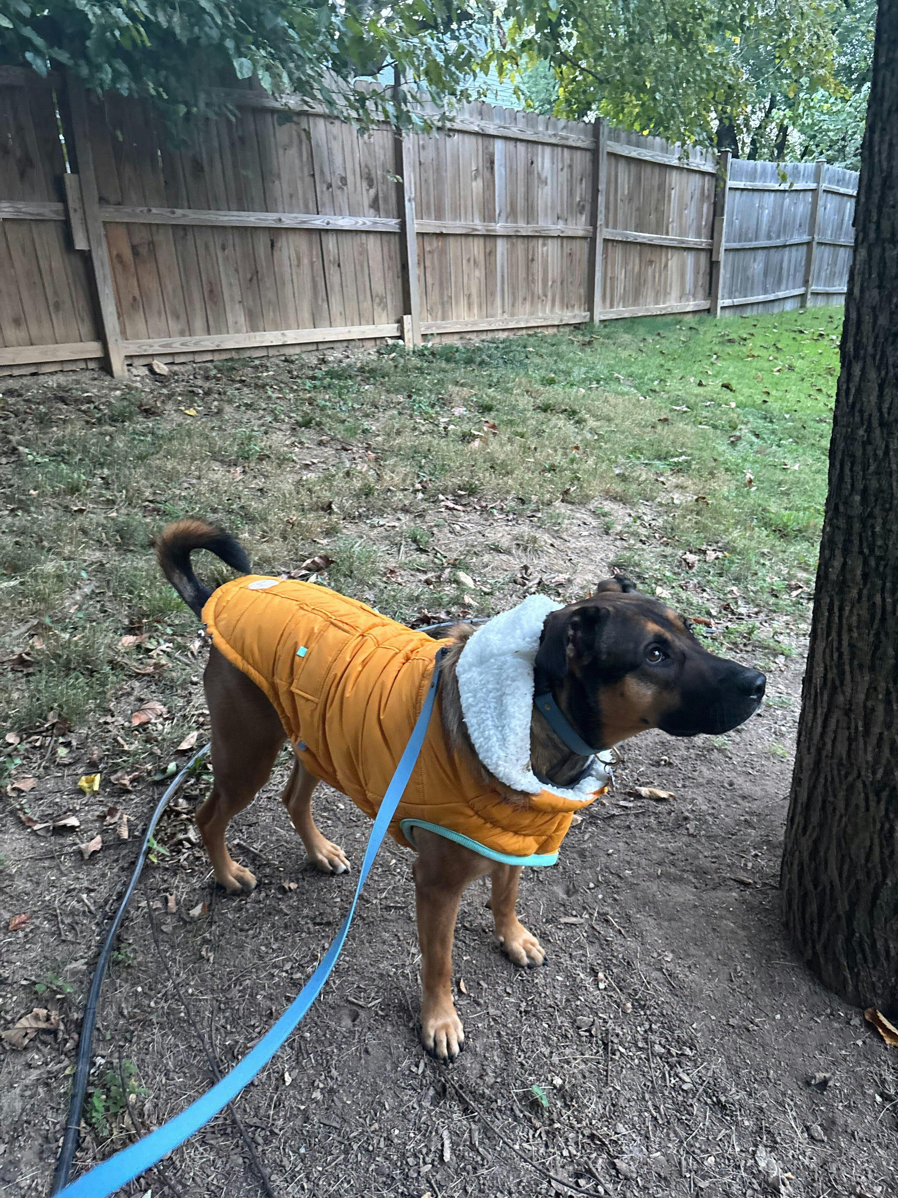 I ordered this for our 2 year old pit girl. She is high energy and can jump high in her new coat.