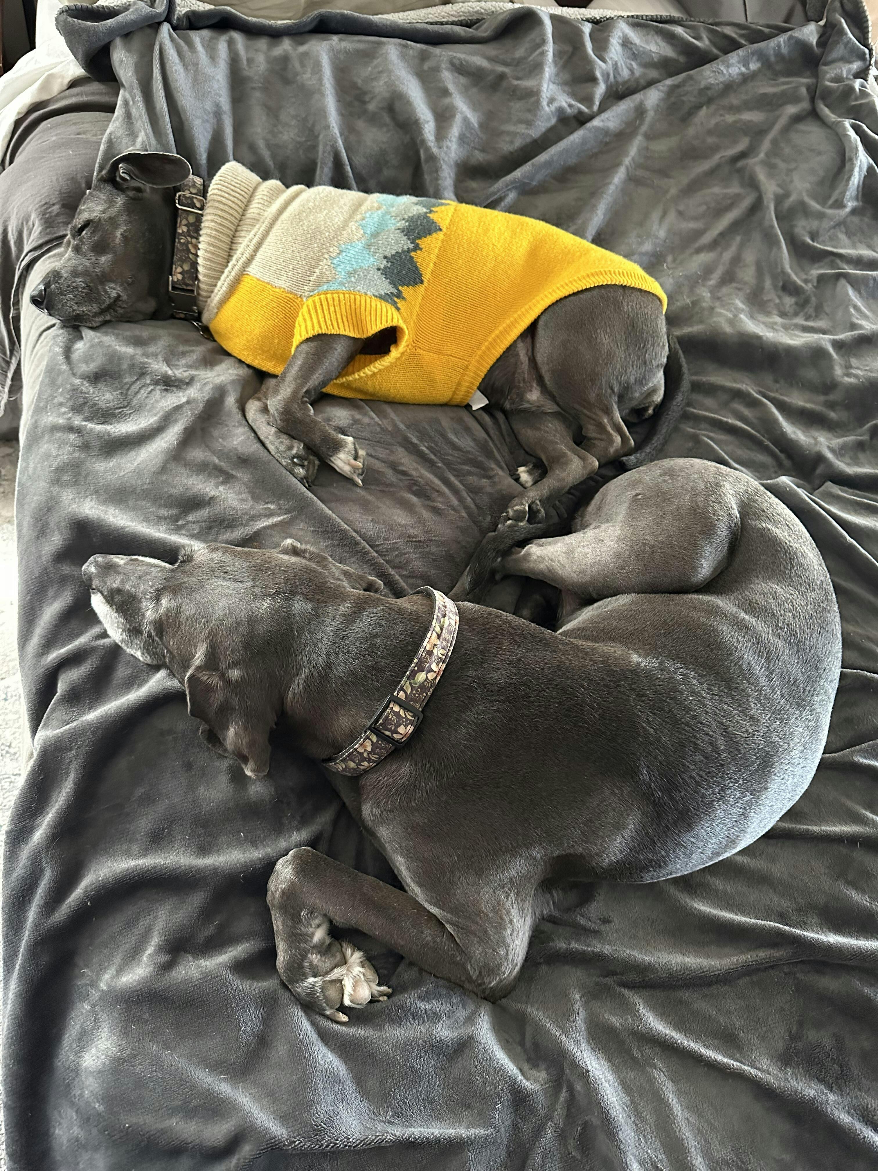 Penny loves her new sweater! Unlike her old sweaters, this one covers her loooong neck, more of her belly, and even part of her front legs. (photo: relaxing with her visiting grandma)